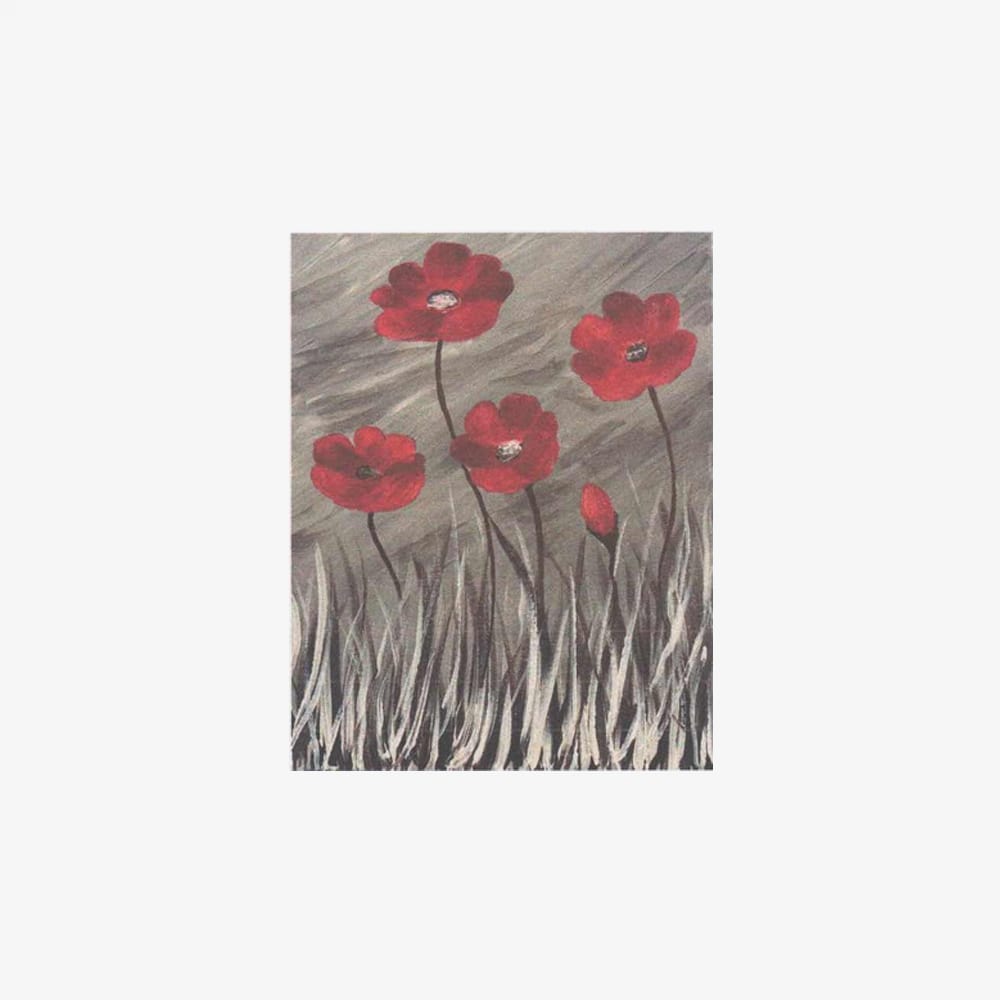 Bold red poppies stand tall in a field of sweeping grey, capturing both softness and strength in every brushstroke.