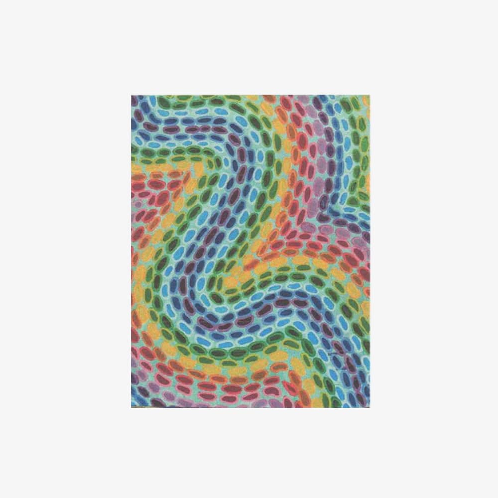 An abstract painting characterized by gentle swirling pebbles of colours in shades of blue, orange, red, green, and yellow.